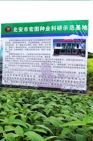 北安市宏圖種業(yè)有限公司是一家及大豆育種研發(fā)、生產(chǎn)加工、銷售于一體的種業(yè)企業(yè) ,成立于2010年6月24日。公司坐落在北方邊陲重鎮(zhèn)北安市趙光鎮(zhèn),公司擁有趙光農(nóng)場(chǎng)、紅星農(nóng)場(chǎng)、建設(shè)農(nóng)場(chǎng)等多家良種繁育基地。得天獨(dú)厚的地理優(yōu)勢(shì)為繁育出優(yōu)質(zhì)的大豆種子提供了便利的條件。